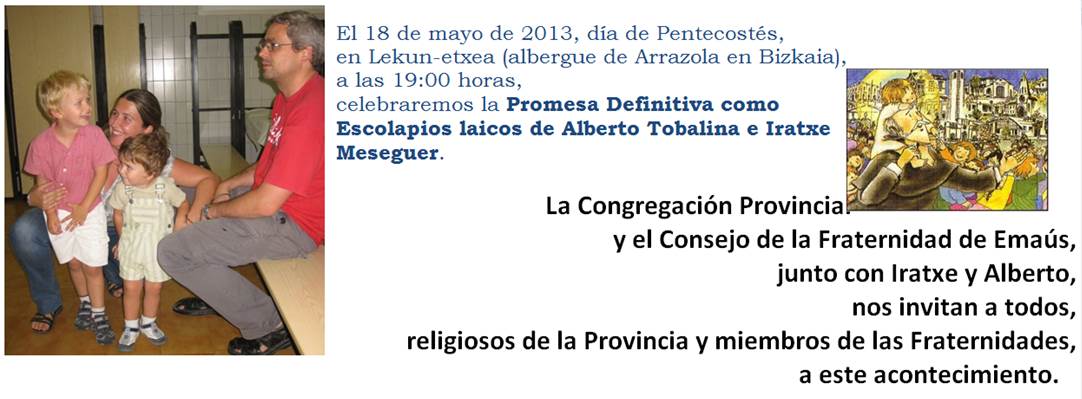 Los dos son miembros de la Fraternidad Itaka de Emaús y dan ahora ese paso de integración carismática y también jurídica con las Escuelas Pías. Tras su promesa recibirán también los ministerios escolapios de la educación cristiana y la atención a los niños pobres.