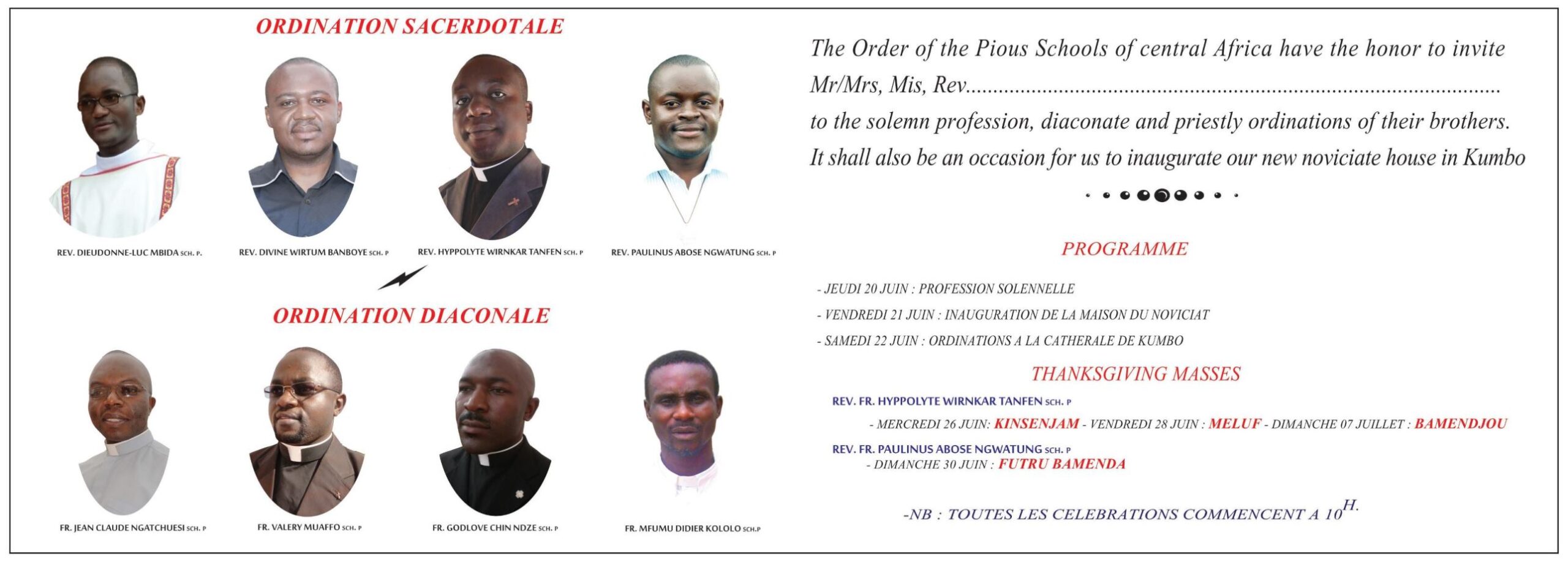 - Profesión Solemne y Ordenación de diaconado de 4 hermanos que han acabado su formación inicial. Uno de ellos, Didier Kololo, es el primer escolapio de Congo.