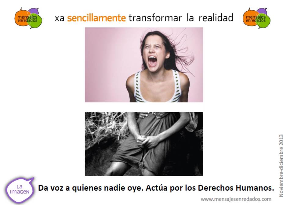 Hay algo con lo que no cuentan quienes vulneran Los derechos humanos: a veces, las víctimas no están solas. Miles de personas unen sus fuerzas en todo el mundo para exigir el respeto de los Derechos Humanos: luchar contra la pena de muerte, controlar el comercio internacional de armas o evitar la exclusión de personas por todo tipo de discriminación. ¿Quieres ser una de ellas?