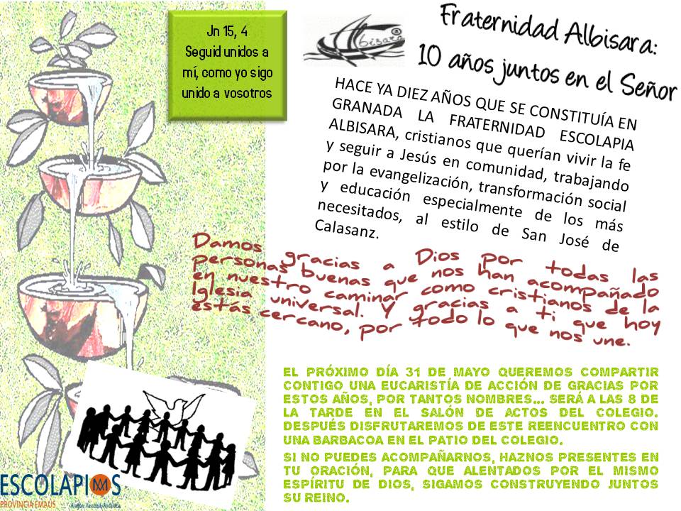 Entresacado de la revista Genil, de la presencia escolapia en Granada, destacamos estas páginas que hablan de los diez años vividos de esta Fraternidad local de Albisara de Emaús: http://www.escolapios21.org/wp-content/uploads/2014/06/Granada-Albisara-140600.pdf