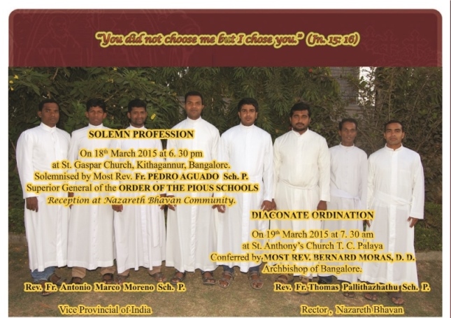 INDIA: PASOS CON ESCOLAPIOS JÓVENES 20/03/2015 El 18 y 19 de marzo son días de profesiones solemnes y de ordenaciones diaconales para ocho jóvenes escolapios de India. ¡Enhorabuena! Oramos por vosotros.