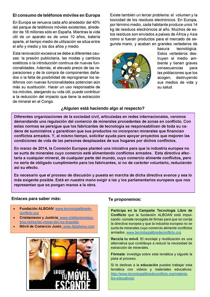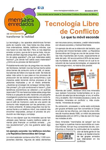 Con el objetivo de seguir promoviendo la reflexión y el compromiso solidario en temas de especial interés social y actualidad. En esta ocasión, el mensaje plantea la relación de los productos tecnológicos de consumo y uso habitual con la violación de los derechos humanos y los conflictos en algunos lugares de nuestro mundo. Para ello, nos acercamos a la campaña “Tecnología Libre de Conflicto”, impulsada por la organización Alboan y que se dirige a incidir y transformar esta realidad. Como es habitual, el mensaje incluye una breve explicación y vínculos de interés para profundizar en la cuestión, así como alguna propuesta de acción.
