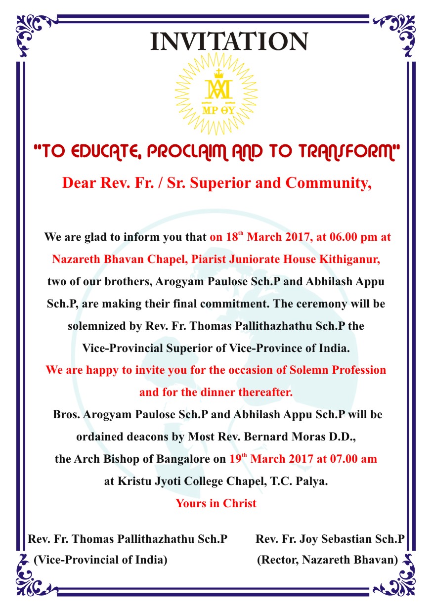 Este sábado, 18 de marzo, dos hermanos escolapios, Arogyam Paulose y Abhilash Appu, harán su profesión solemne. Al día siguiente serán ordenados diáconos.