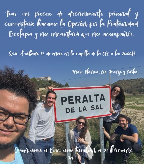 Este sábado, 13 de enero, celebramos en la Comunidad Cristiana Escolapia de Granada el paso a la Fraternidad de Iñaki, Blanca, Leo, Juanjo y Carlos: cinco jóvenes que, tras su discernimiento, optan entrar a formar parte de la Fraternidad de Albisara.