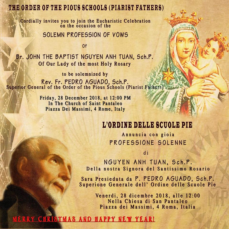 El 28 de diciembre, en nuestra iglesia de S. Pantaleo de Roma, el hermano Nguyen Anh Tuan hará su profesión solemne como religioso escolapio.
