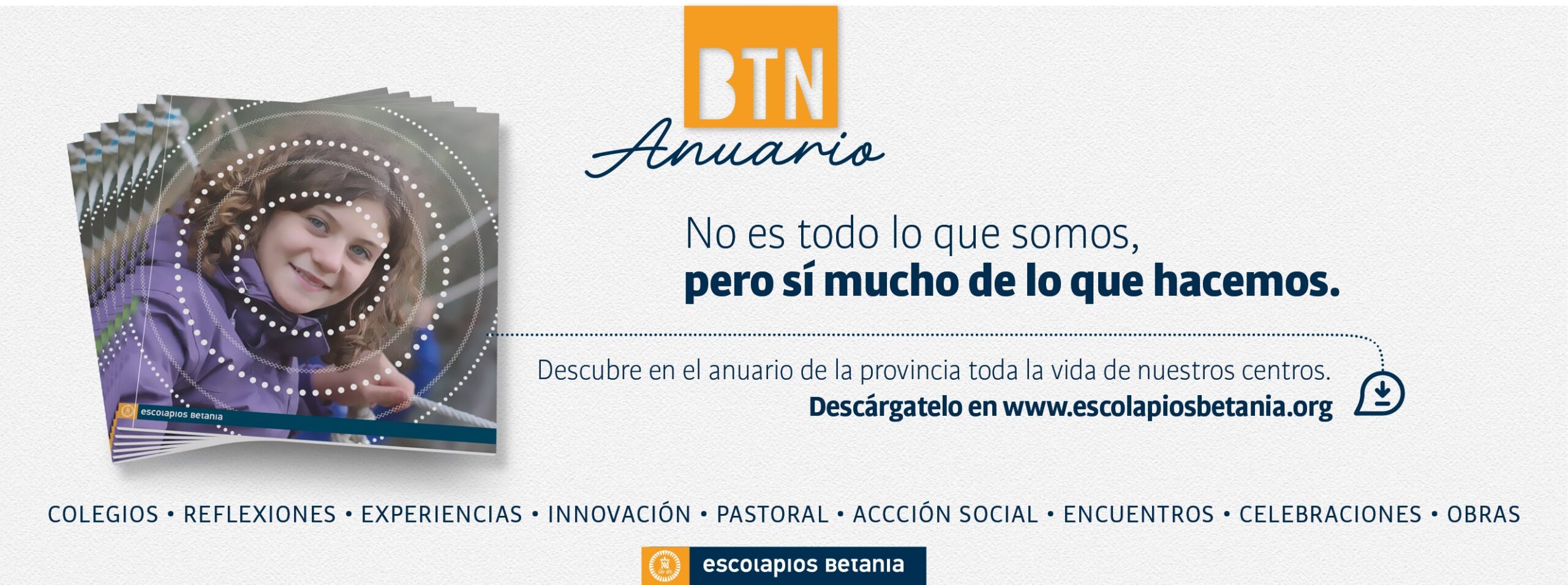 Con el lema Contigo Más el BTN “nos recuerda una parte de la vida que hay, la que transcurre entre nosotros, la que intentamos alimentar y compartir como Escuelas Pías”, señala el P. Daniel Hallado en su presentación. El anuario, de más de un centenar de páginas, recoge, entre otros, los testimonios de Alfredo y Elena en su experiencia de voluntariado en Indonesia, la iniciativa socioeducativa de Itaka o la aportación de Betania al pasado Sínodo escolapio. Hay además una cuidada presentación del Proyecto ArtEscolapio, de impulso de nuestro Patrimonio histórico-artístico.