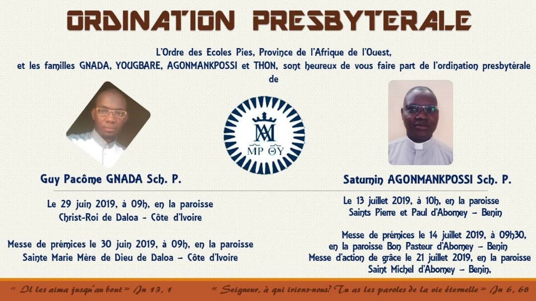 El 29 de junio en Daloa (Costa de Marfil) y el 13 de julio en Aborney (Benin) serán ordenados sacerdotes los escolapios Guy Pacôme Gnada y Saturnino Agonmankpossi.