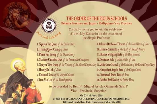 22 de junio, 16 NUEVOS RELIGIOSOS ESCOLAPIOS 17/06/2019 El próximo sábado, 22 de junio, en Cebú (Filipinas) harán su profesión como religiosos escolapios 16 jóvenes de diversos países de Asia que han estado haciendo su noviciado en esta ciudad. ¡Qué maravilla!