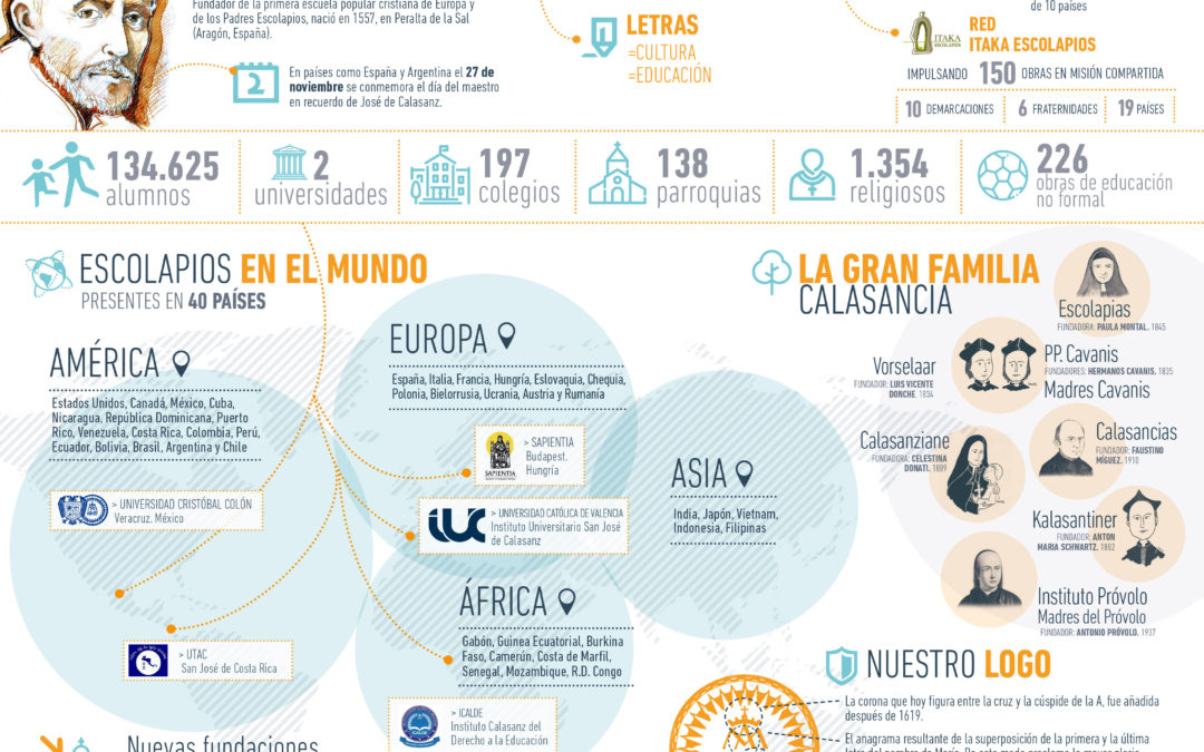 El infograma de la Orden de las Escuelas Pías ya está disponible con los datos actualizados, tanto de las cifras como de las nuevas fundaciones y presencias. El infograma constituye un material muy útil para ofrecer una panorámica de las Escuelas Pías a lo largo de la historia. El cartel, disponible en los cuatro idiomas oficiales, recoge desde claves educativas hasta el mapa de la familia calasancia o las claves de la identidad escolapia.