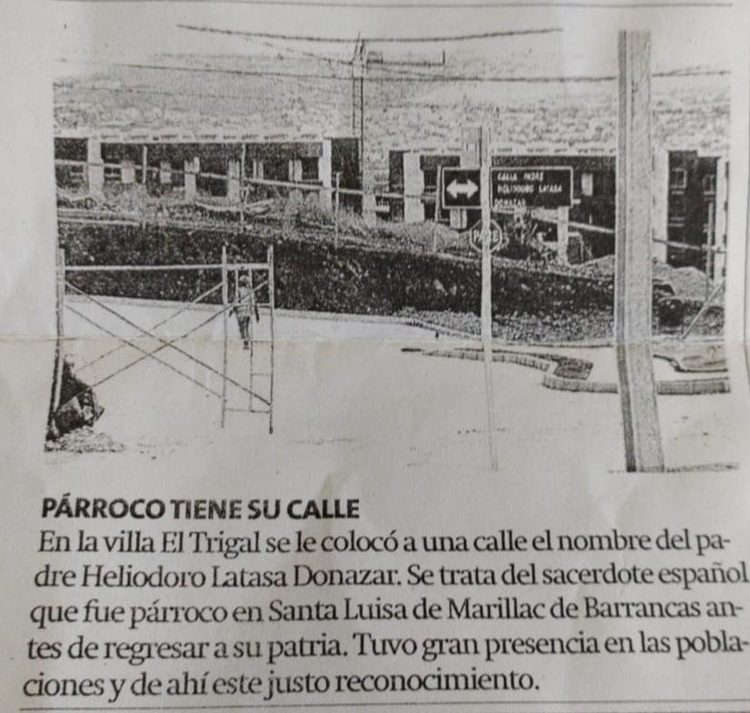 Adjuntamos la reseña del periódico chileno de este reconocimiento escolapio. Una calle en San Antonio de Barrancas a nombre de Heliodoro Latasa. Heliodoro, actualmente en nuestra comunidad de Tafalla, se ofreció a trabajar en tierra chilena al “jubilarse” de sus tareas lectivas y organizativas, y ha trabajado durante más de 10 años en nuestra parroquia Santa Luisa de Marillac, en el Puerto de San Antonio, Barrancas, en el que además dirigimos el “Instituto del Puerto” desde 1984.