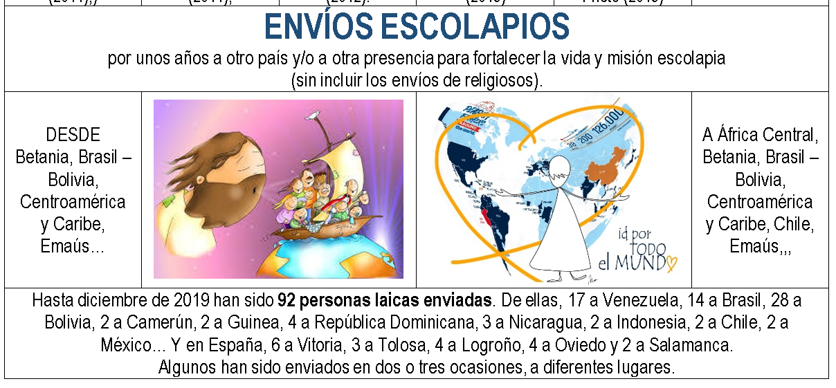 Las «obediencias y nuevos destinos» para los religiosos es una constante en la vida consagrada y también en los escolapios. La Fraternidad introduce la novedad de los envíos de laicos y laicos, a veces con sus hijos, por parte de la Provincia y la Fraternidad, muchas veces por medio de Itaka – Escolapios, a otros países o a otras localidades, a veces por tiempo limitado y otras veces de manera indefinida, para reforzar la vida, la misión y la presencia escolapia.