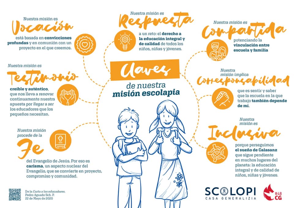 Una imagen que nos presenta algunos elementos fundamentales en nuestra misión escolapia. Son aspectos tomados de la carta del P. General a los educadores que podemos encontrar en https://scolopi.org/carta-a-los-educadores-y-educadoras-de-las-escuelas-pias/?fbclid=IwAR1QPFJVwTVYsNOhwtVgqxuM-AwJWp77BvAxaPI4UoI8JxKtXtCq8ZaMkwY