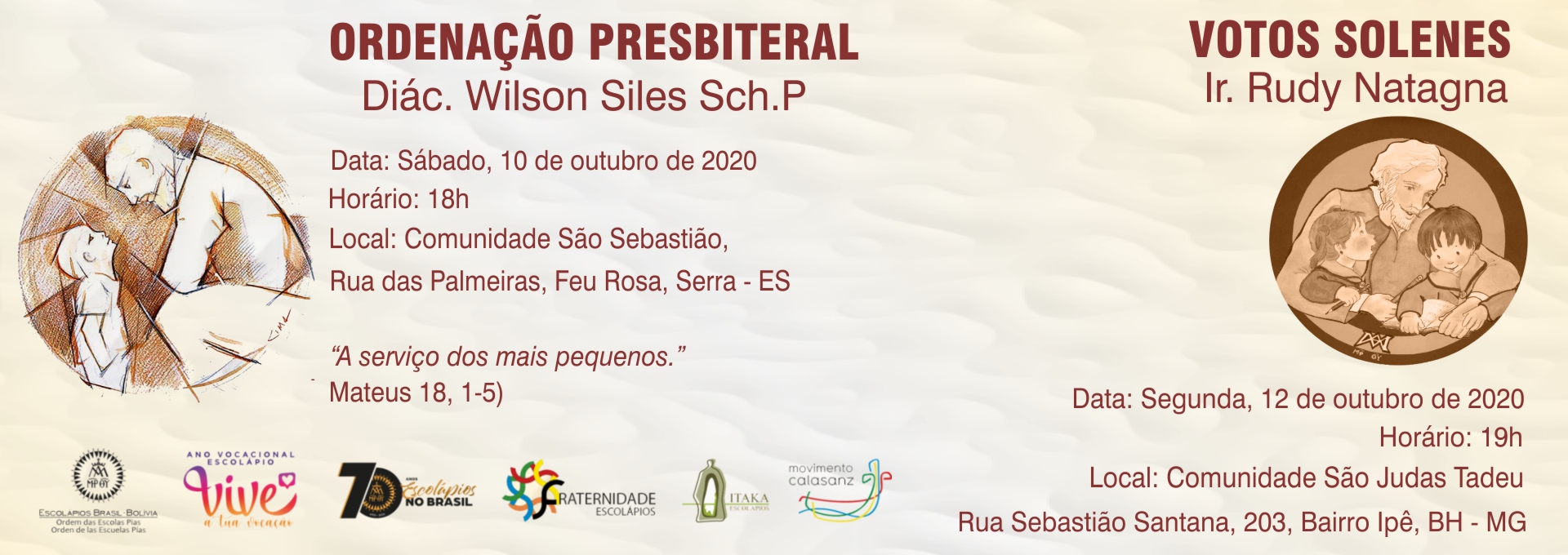 Cuando celebramos los 70 años de presencia escolapia en Brasil, tenemos la alegría de tener una importante fiesta escolapia con la ordenación sacerdotal de Wilson Siles en Serra el 10 de octubre y la profesión solemne de Rudy Natagna en Belo Horizonte el día 12 de octubre.