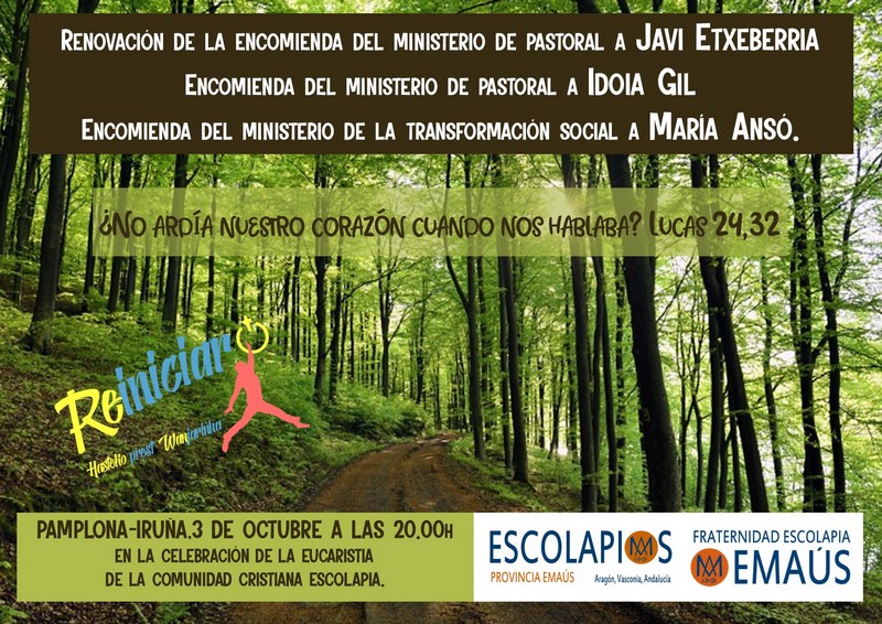 El 3 de octubre, en Iruña – Pamplona (España) la Provincia y Fraternidad de Emaús encomiendan, en el marco de la celebración de la Eucaristía de la Comunidad Cristiana Escolapia, el ministerio de pastoral a Idoia Gil, el ministerio de la transformación social a María Ansó y renuevan a Javier Etxeberria el ministerio pastoral, por tercera vez y después de veinte años de ejercicio de dicho ministerio.