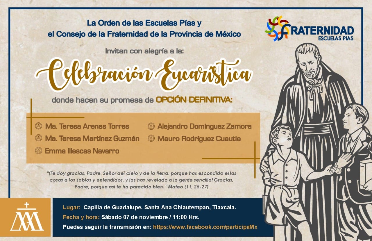 Con gran alegría el Secretariado de Participación de la Provincia Escolapia de México, el Consejo de la Fraternidad y las comunidades de referencia invitan a la Celebración Eucarística en donde cinco de sus hermanos harán la opción definitiva por su Integración Carismática. ¡Dios bendiga este paso en su vocación cristiana!