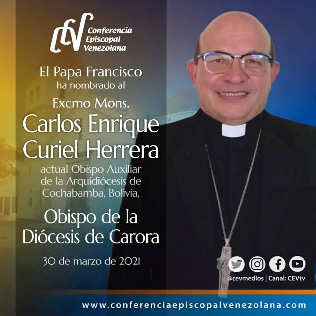 La Diócesis de Cochabamba lo publica así: https://www.iglesiacbba.org/mons-carlos-curiel-ha-sido-nombrado-obispo-de-carora-venezuela/