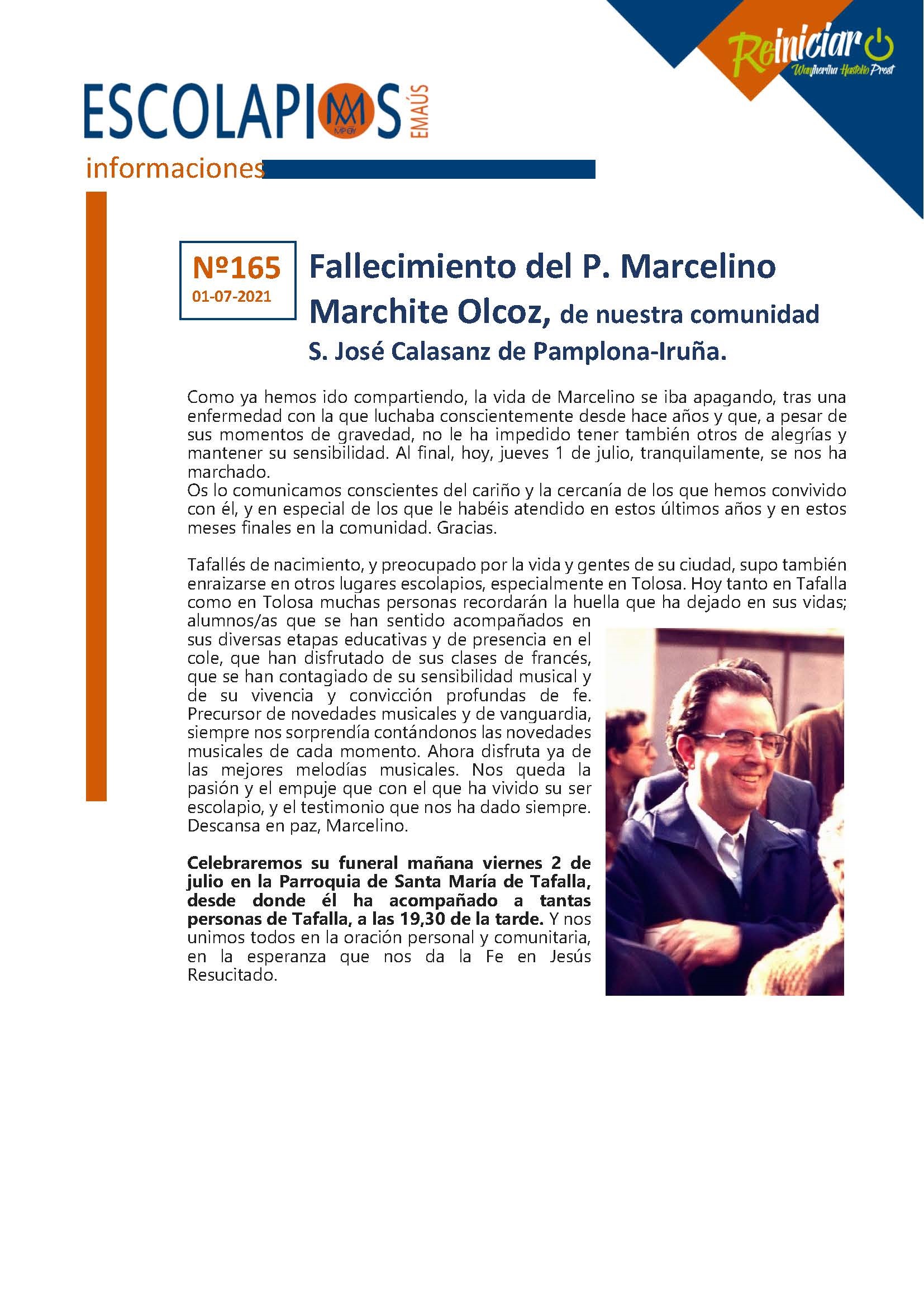 El 1 de julio el P. Marcelino Marchite fallecía en nuestra residencia escoapia de Pamplona – Iruña, a los 89 años de edad, después de 72 años de vida escolapia.