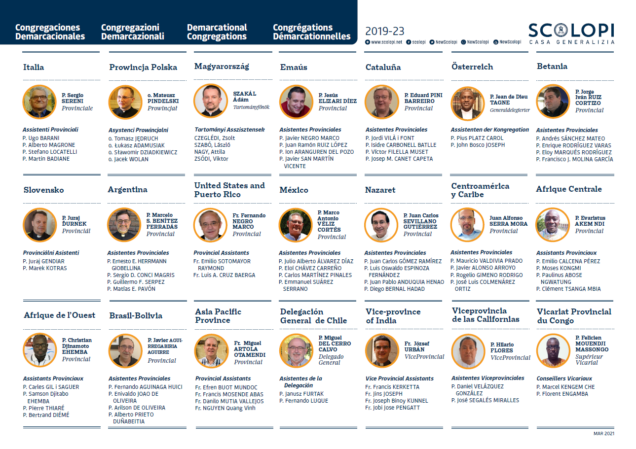 Contamos con varios infogramas que nos presentan cada una de las Demarcaciones que forman la Orden de los escolapios con una información básica de su realidad como podemos ver en https://scolopi.org/demarcaciones/, y también una imagen de los equipos responsables de impulsar estas Demarcaciones que colocamos a continuación.