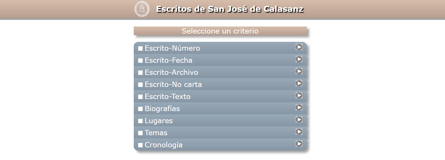 Contamos con un excelente recurso en scripta, el sitio web donde se accede electrónicamente a todos los escritos de Calasanz, con un sistema de búsqueda muy apropiado. Lo encontramos en http://scripta.scolopi.net/calasanz/default.asp?Idioma=Castellano