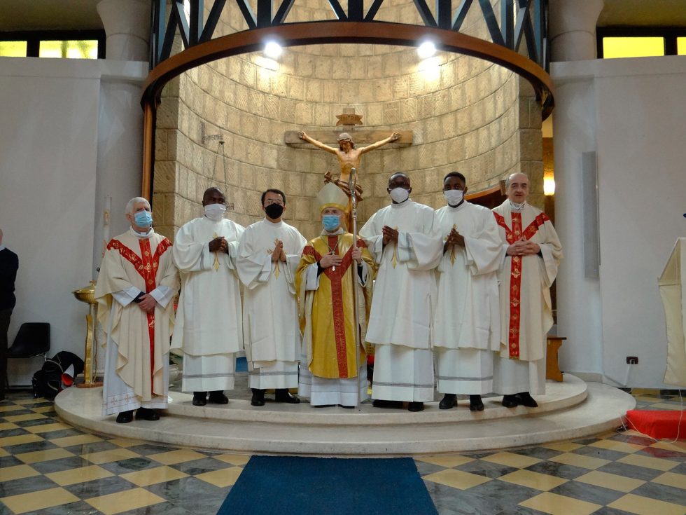 Ordenación diaconal de Brian Yuh WOMEI, André Serge FOUDA, Brandon Sekuna TCHATIEN NUVAGA y NGUYỄN VĂN VIỆT en nuestra parroquia de San Francisco de Asís de Roma, presidida por S.E.R. Mons. Ignazio Sanna, presidente de la Pontificia Academia de Teología.