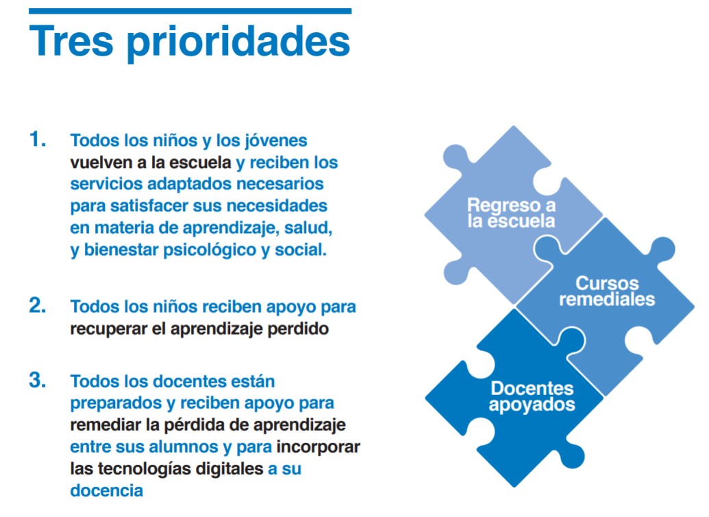 Hay que apagar el incendio ya mismo. El aprendizaje de los niños ha sufrido enormemente. Y como el sector de la educación también es fuente de salud, nutrición y servicios psicosociales, el bienestar global de los niños se ha visto mermado considerablemente. La recuperación tiene que empezar ya. Por eso, la UNESCO, el UNICEF y el Banco Mundial indican tres prioridades: