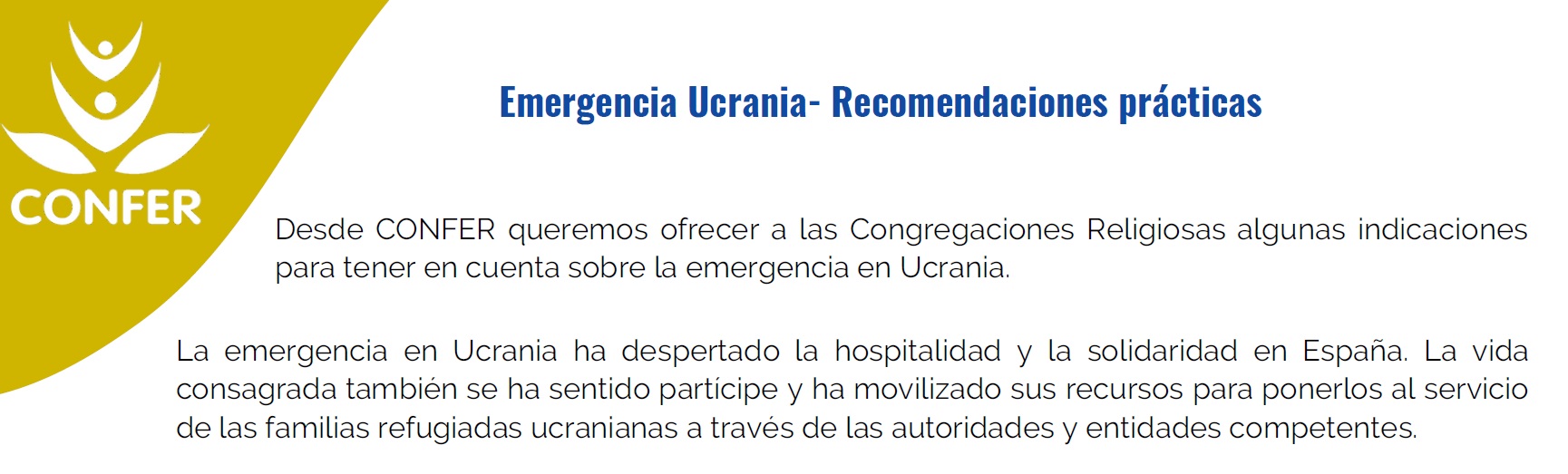 La Confer (Conferencia de Religiosos de España) ofrece a las Congregaciones religiosas unas consideraciones de gran interés para responder a la situación de emergencia de Ucrania: acogida de refugiados y ayuda solidaria, como podemos ver en https://www.escolapios21.org/wp-content/uploads/2022/03/9916-emergencia-ucran.pdf