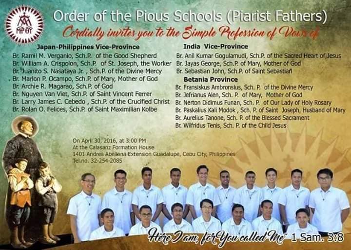 17 NUEVOS RELIGIOSOS ESCOLAPIOS EN FILIPINAS 30/04/2022 Hoy hecho su primera profesión de votos como religiosos escolapios ocho jóvenes de Filipinas, 3 de India y 6 de Indonesia. Damos gracias a Dios por esta elección de jóvenes y le pedimos que los acompañe siempre.