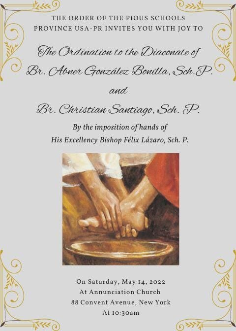 Profesión solemne de Abner GONZÁLEZ y Christian SANTIAGO en nuestra parroquia de Santa Helena de Nueva York,  presidida por el P. Provincial el día 13… y al día siguiente serán ordenados diáconos por S.E.R. Mons. Félix Lázaro Sch. P., obispo emérito de Ponce.