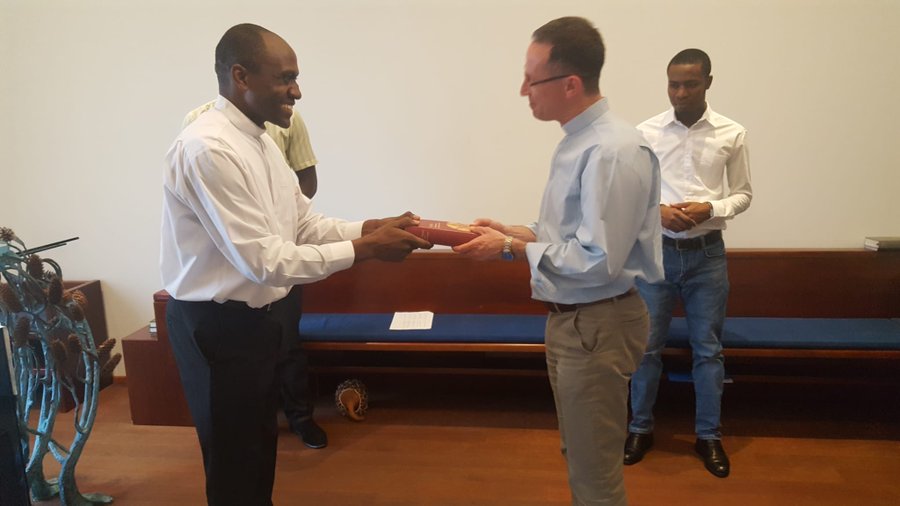 Hay un cambio en la Provincia de Austria: el P. Zsolt asume la encomienda de Superior Provincial… como vemos en la foto donde el P. Jean de Dieu Tagne, anterior Provincial, le hace entrega de ese signo.