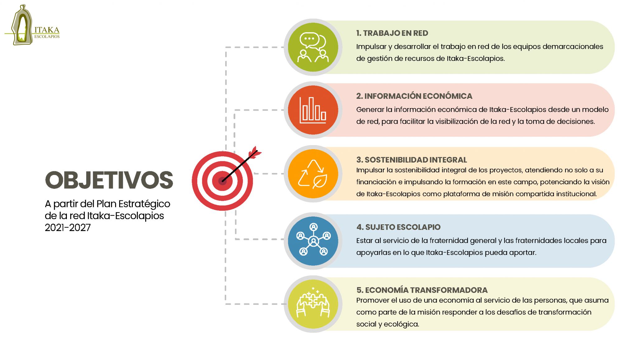 El equipo general de gestión de recursos de la red Itaka-Escolapios elaboró hace unos meses sus objetivos para el periodo 2021-2027, alineados con los objetivos del Plan Estratégico de la red Itaka-Escolapios para el sexenio. En la imagen podemos ver los objetivos que se marca.