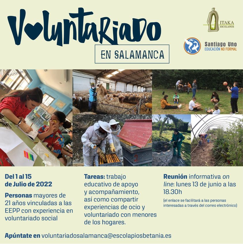 EXPERIENCIA DE VOLUNTARIADO SOCIAL EN SALAMANCA 28/05/2022 Una oferta educativa y social de los escolapios de Salamanca (España) para jóvenes que quieren colaborar en la construcción de un mundo mejor y transformar sus propias vidas.