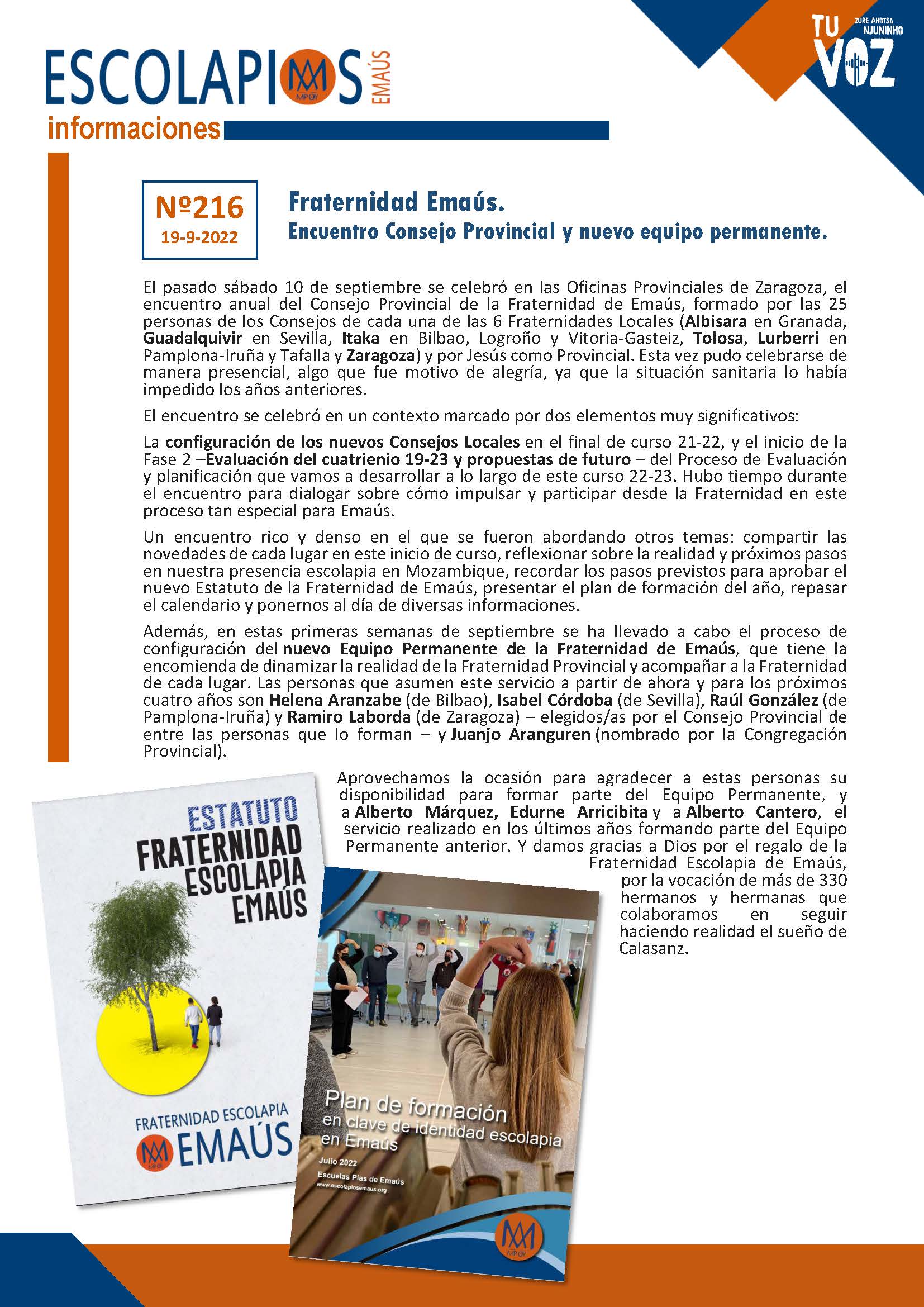 Además, en estas primeras semanas de septiembre se ha llevado a cabo el proceso de configuración del nuevo Equipo Permanente de la Fraternidad de Emaús, que tiene la encomienda de dinamizar la realidad de la Fraternidad Provincial y acompañar a la Fraternidad de cada lugar. Las personas que asumen este servicio a partir de ahora y para los próximos cuatro años son Helena Aranzabe (de Bilbao), Isabel Córdoba (de Sevilla), Raúl González (de Pamplona-Iruña) y Ramiro Laborda (de Zaragoza) – elegidos/as por el Consejo Provincial de entre las personas que lo forman – y Juanjo Aranguren (nombrado por la Congregación Provincial).
