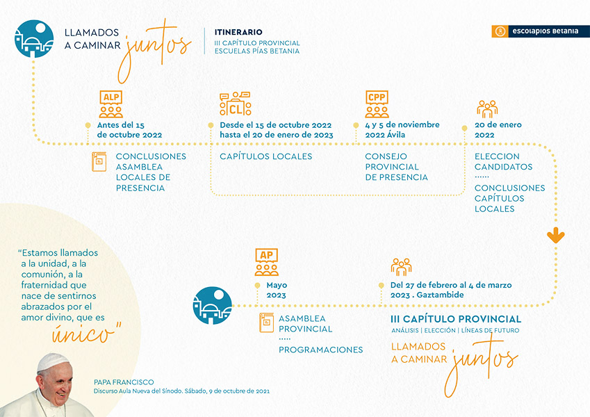 Los escolapios de Betania han elaborado una página web para acompañar la marcha del III Capítulo Provincial: la podemos encontrar en https://www.llamadosacaminarjuntos.com/, donde podemos ver logo, claves, noticias…