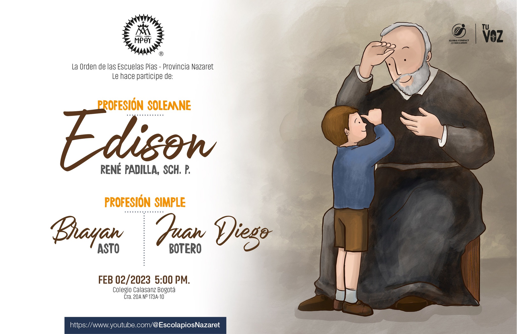 El próximo 02 de febrero a las 5:00 pm. (Hora de Colombia) la #ProvinciaNazaret celebra la Profesión Solemne de Edison Padilla (Ecuador) y la Profesión Simple de los novicios Brayan Asto (Perú) y Juan Diego Botero (Colombia). #Streaming Canal de Youtube: