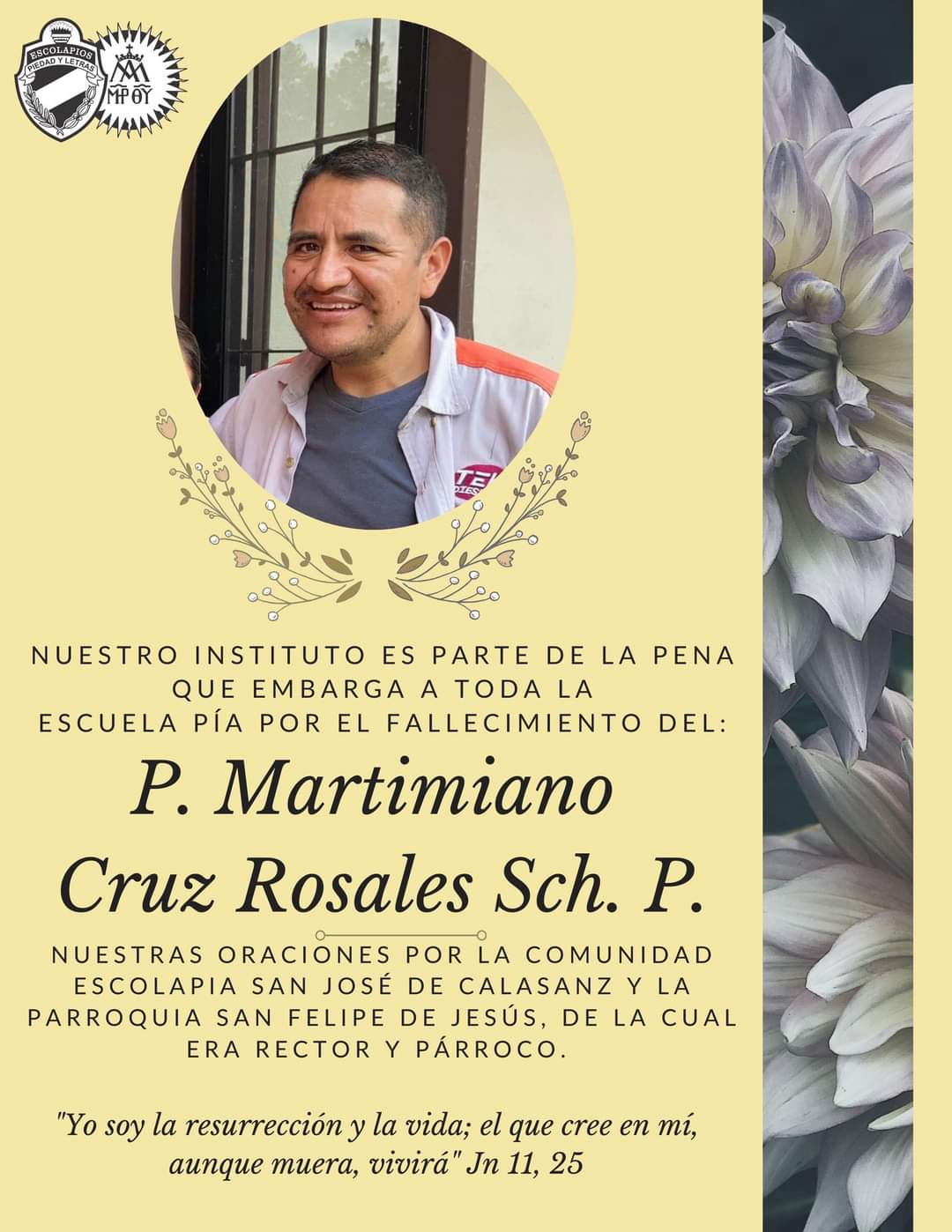 Descansa en paz el P. Martimiano Cruz Rosales de Cristo y San Rafael Guizar que falleció el 05 de febrero 2023 en la Comunidad de Felipe Carrillo Puerto, (Campeche, México). Nacido el 09 de Julio de 1981. Fue religioso escolapio, Párroco, Rector y Asistente Provincial en México. Damos gracias a Dios por su vida y por su servicio a la Orden.