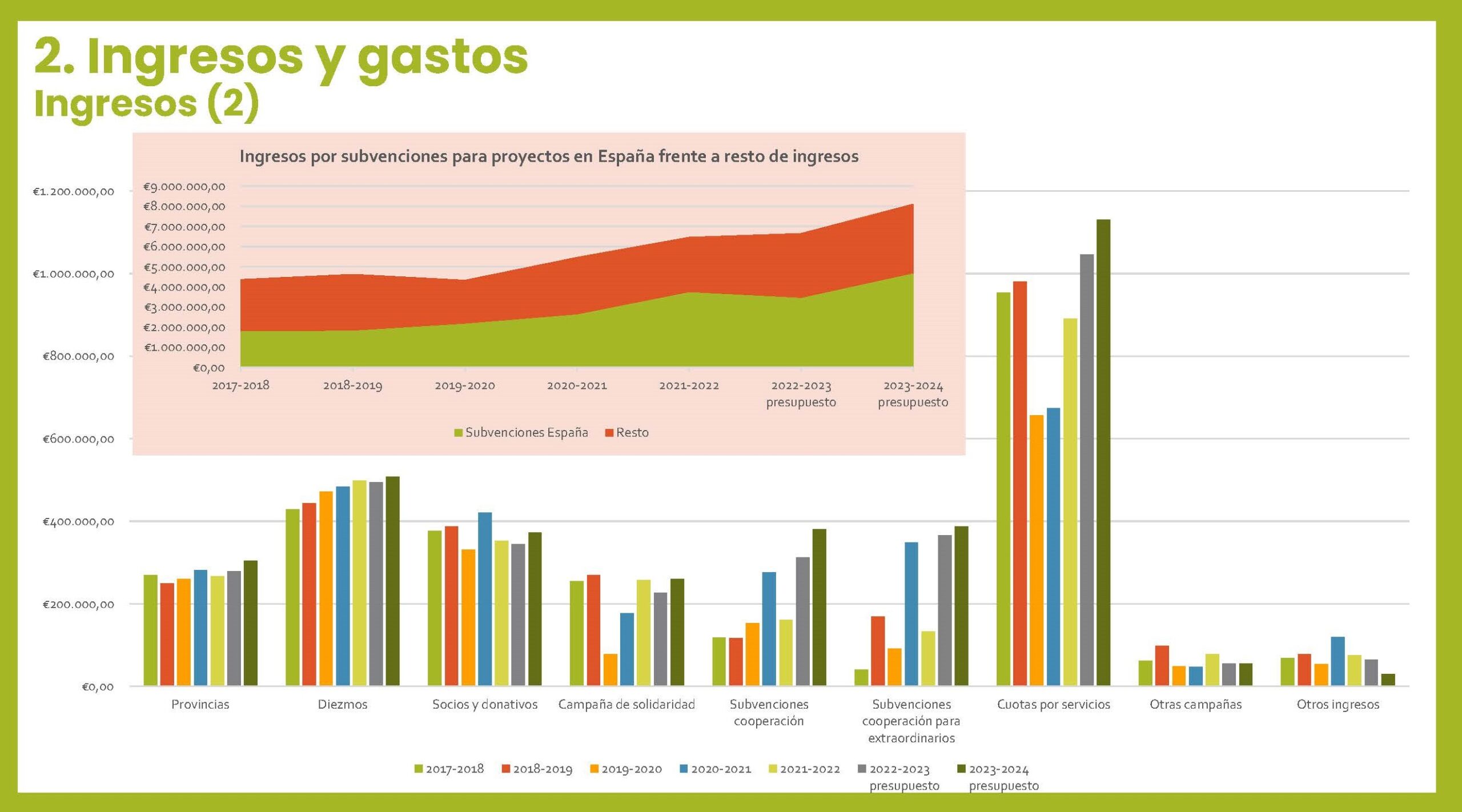 Como podemos ver, es grande el porcentaje de ingresos que proviene de convenios y subvenciones para proyectos en España. Y también conviene presentar y agradecer otras entradas previstas de la Orden de los escolapios, de la Fraternidad, de socios, campañas, proyectos de cooperación internacional, cuotas y servicios…