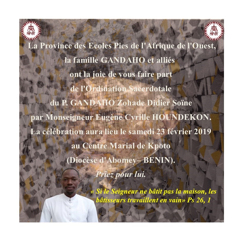 - La Ordenación sacerdotal de Pedro da Cruz, Archie MAGARAO y Ramil Verganio MENDOZA, y diaconal de Hermann Fabrice DZODJOU, Jean Cédric ANGO, Frak Thierry TENE FONKOU, Desiderio OSA EDU NZANG, Kevin TANTOH AZONG, Francis NKENGAFAH EBESOH, Anselmo NGUEMA OBIANG MBEZEE, Jean Paul PREIRA, Jean ROUAMBA, Louis Yoba DIATTA, Placice Munkwenda MANDONA, Stephane KOUADIO, Eric Esperant KAH, Nialo NIANG, Erwin FAHIK, Jaffarson J. OPAON, Gerysan ANDRINO, Nguyen HA Hong y Nguyen Van PHUC. La ordenación tendrá lugar en nuestra iglesia de San Pantaleo y San José de Calasanz de Roma y será presidida por S.E.R. Mons. Carlos Curiel Sch.P., obispo de Carora (Venezuela).