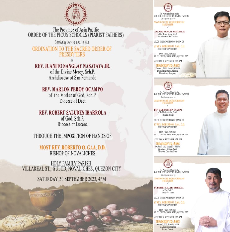 30 septiembre, TRES NUEVOS SACERDOTES ESCOLAPIOS 23/09/2023 El 30 de septiembre Juanjito, Marlon y Robert serán ordenados sacerdotes escolapios en la Parroquia escolapia de Novaliches, en Quezon City (Filipinas). Oramos por ellos.