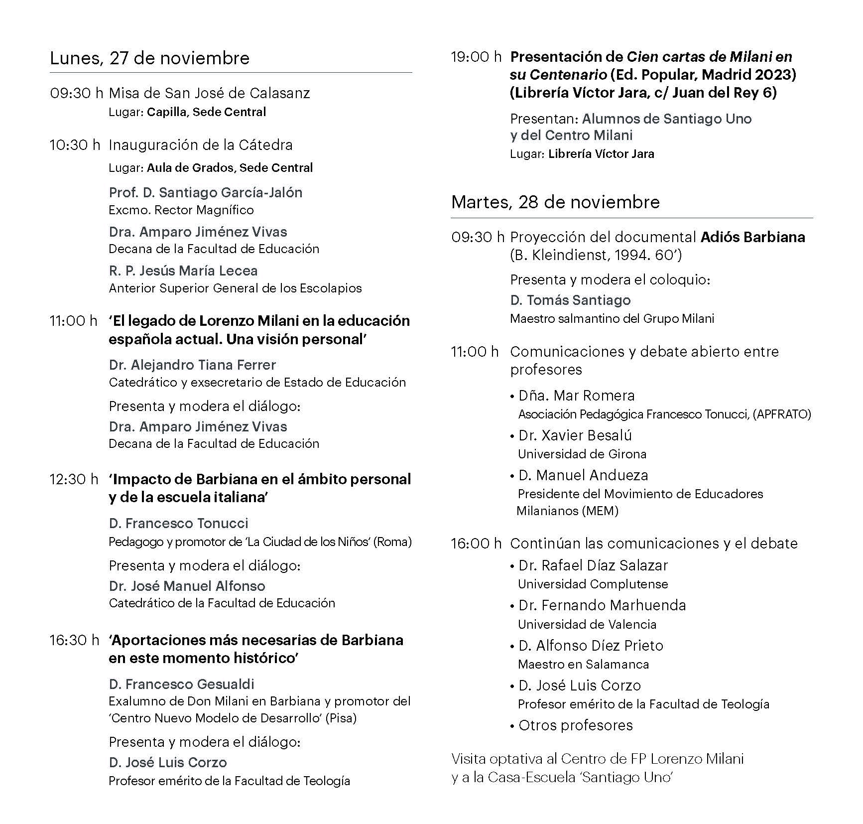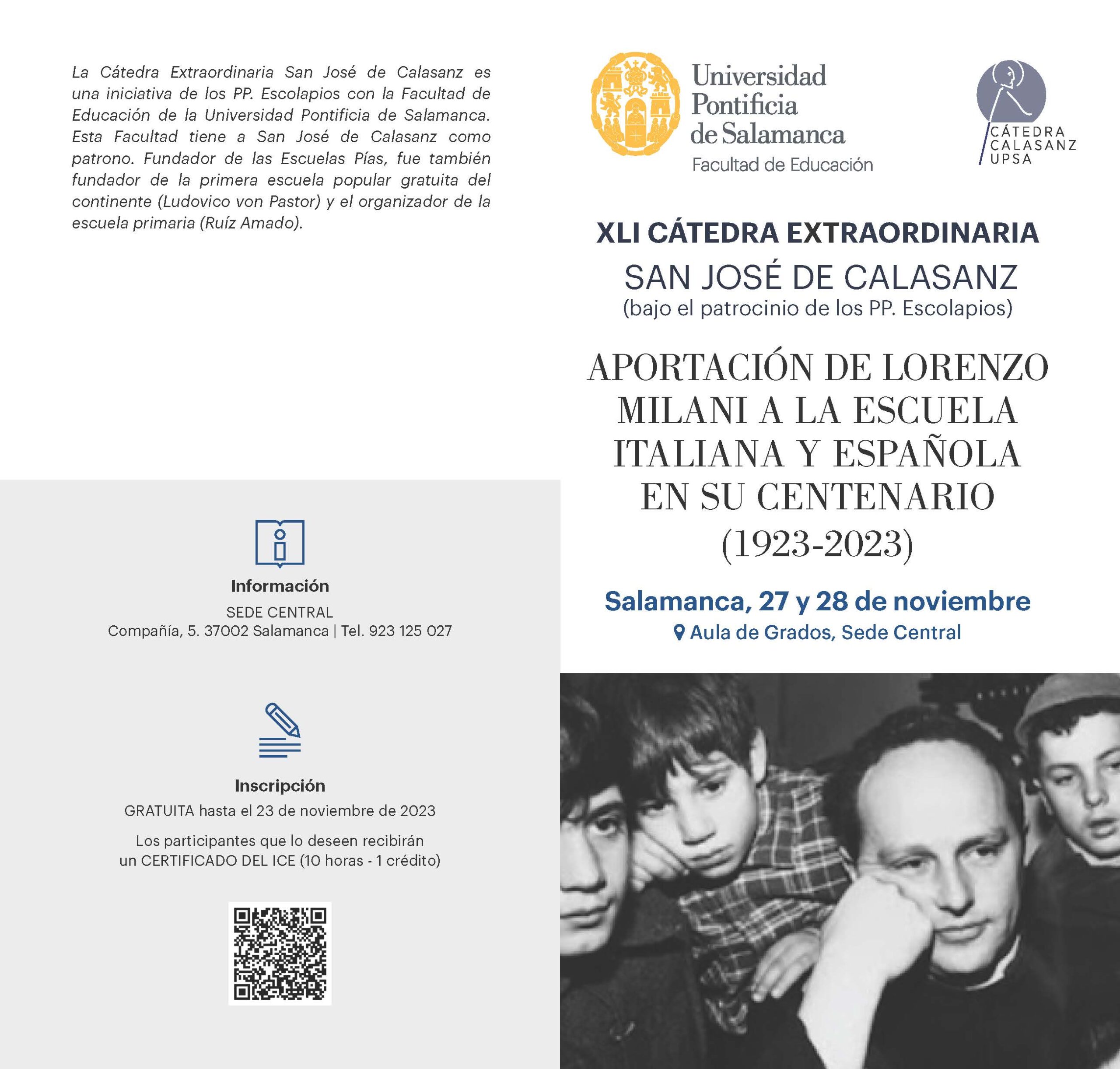 Aportación de Lorenzo Milani a la Escuela italiana y española en su centenario (1923-2023) es el título de la XLI Cátedra extraordinaria San José de Calasanz que, bajo el patrocinio de los PP. Escolapios, organiza la Facultad de Educación de la Universidad Pontificia de Salamanca.