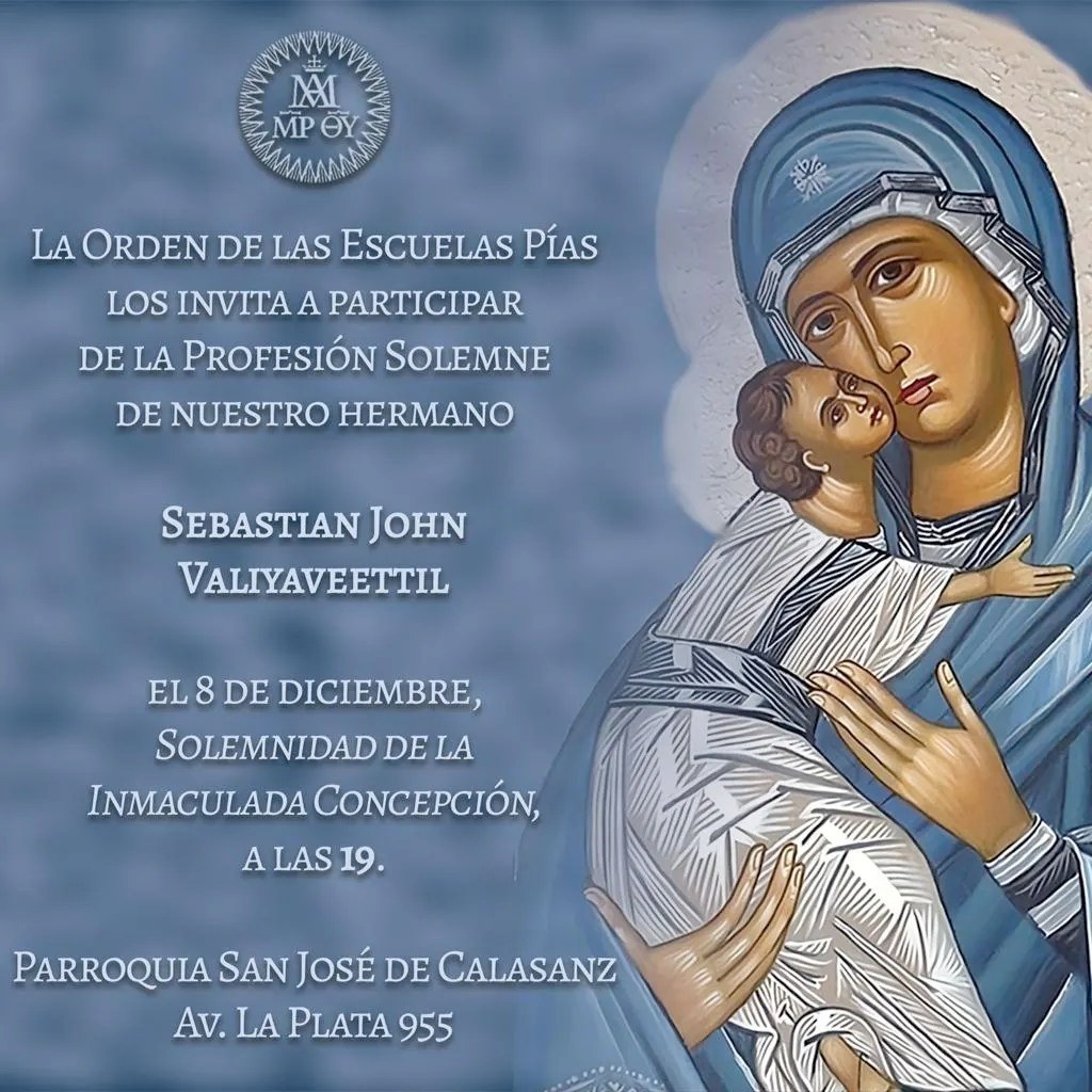 8 diciembre, PROFESÓN SOLEMNE EN ARGENTINA 21/11/2023 El 8 de diciembre, nuestro hermano escolapio Sebastian John Valiyaveettil hace su profesión solemente como religioso escolapio para siempre. Oramos por él.