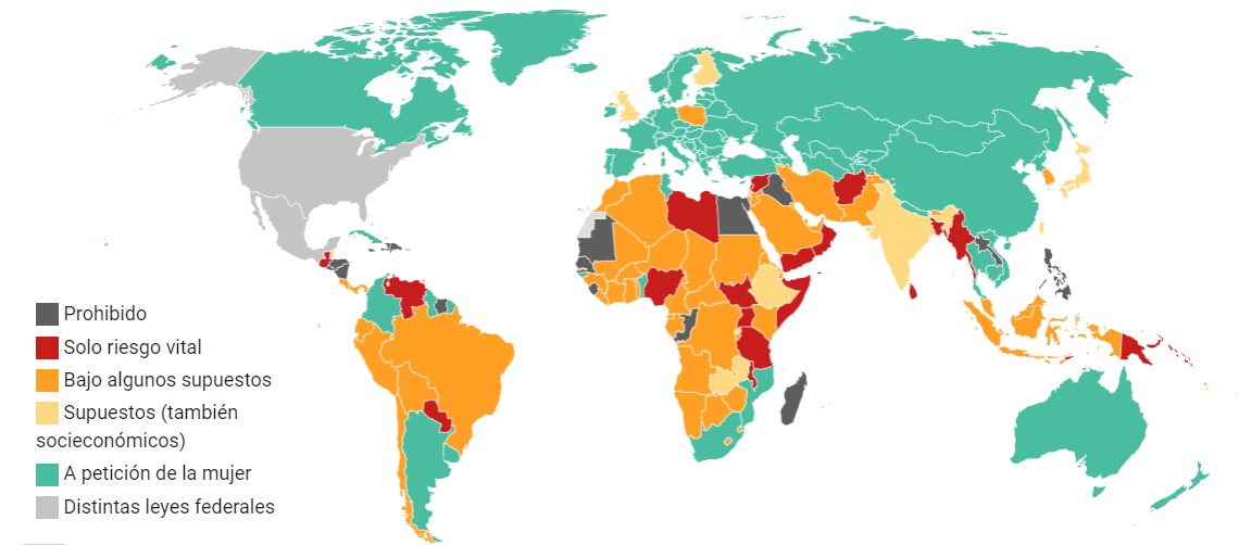 • En 23 países está prohibido sin excepción, en 41 se admite solo para salvar la vida de la mujer, en 49 para preservar la salud, en 13 por motivos socioeconómicos, en 75 está permitido bajo petición (CNN: https://encurtador.com.br/CMQZ9).