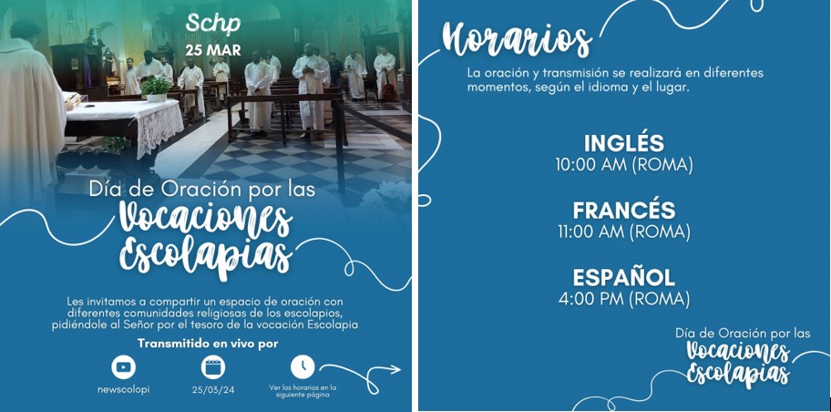 25 marzo, DÍA DE ORACIÓN POR LAS VOCACIONES ESCOLAPIAS 24/03/2024 La Orden presenta una interesante propuesta de rezar juntos virtualmente el dìa 25 de marzo en diferentes idiomas, como podemos ver en la imagen.