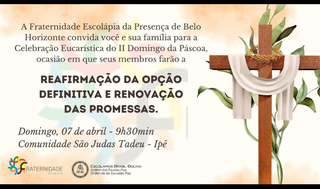 RENOVACIÓN DE LA VOCACIÓN ESCOLAPIA EN FRATERNIDAD 7/04/2024 Hoy los miembros de la Fraternidad de Belo Horizonte (MG – Brasil) reafirman su opción definitiva y promesa de pertenencia a la Fraternidad. Este tiempo de Pascua es un buen momento para ello.