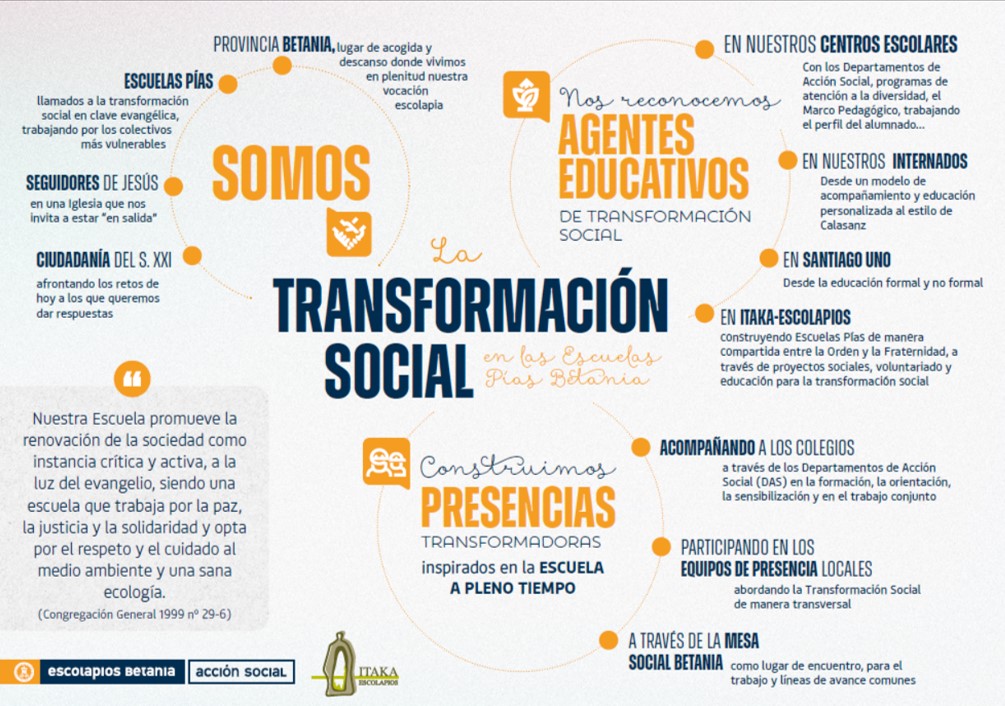En enero de 2020, tras la petición explícita al Equipo Provincial de Itaka-Escolapios de asumir esta encomienda, se inicia la reflexión con la convicción de que las Escuelas Pías nacen para la transformación social, afirmación que fundamenta todo el trabajo posterior. Debido al carácter evangelizador de nuestro modelo educativo, tuvimos claro que la dimensión social es una de las tres piezas claves para el impulso de la misión escolapia (EDUCAR, ANUNCIAR y TRANSFORMAR).