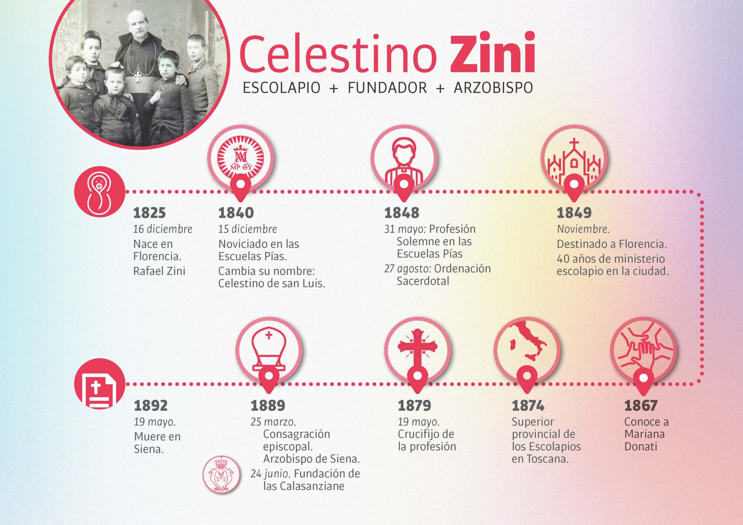 El 19 de mayo de 1892 fallecía en Siena (Italia), Celestino Zini Sch.P. Concluían 67 años de una vida intensa, plena y llena de actividad al servicio de los niños y los jóvenes.