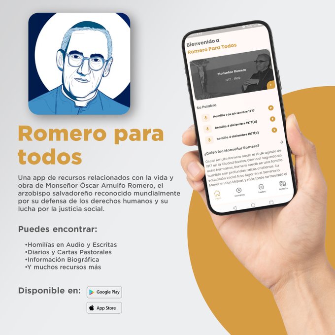 Descarga la app “Romero para todos” y descubre la vida y obra del santo salvadoreño, reconocido mundialmente por su defensa de los #DerechosHumanos y la justicia social. Disponible en iOS y Android.