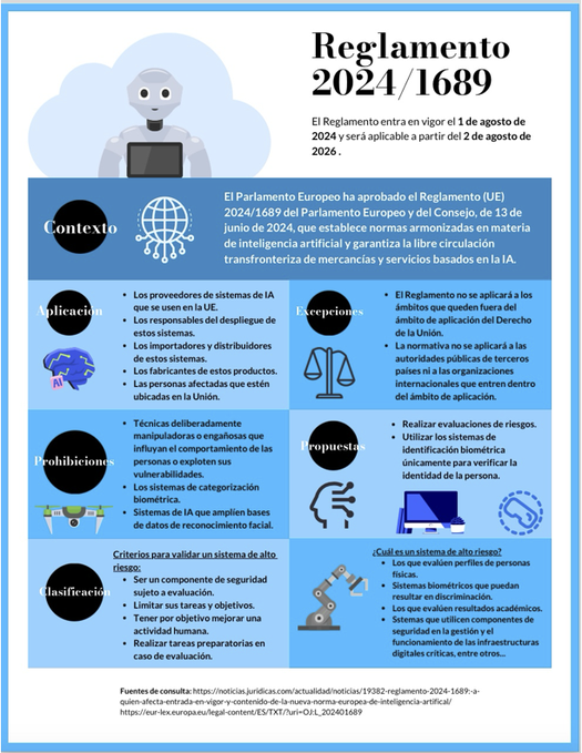 El 12 de julio se ha publicado en el Diario Oficial de la Unión Europea el Reglamento de #InteligenciaArtificial (#AIAct), la primera normativa que regula el uso de la IA. Reglamento disponible en https://eur-lex.europa.eu/legal-content/ES/TXT/?uri=OJ%3AL_202401689