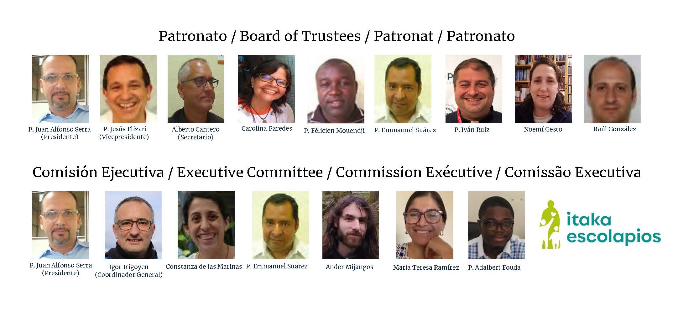 - En primer lugar, el Patronato, que queda ahora formado por el P. Juan Alfonso Serra (Presidente), P. Jesús Elizari (Vicepresidente y Provincial de Emaús), Alberto Cantero (en nombre de la Fraternidad General y Secretario), P. Félicien Mouendji (en nombre de la Congregación General), P. Iván Ruiz (Provincial de Betania), Raúl González (Fraternidad de Emaús), Noemí Gesto (Fraternidad de Betania), P. Emmanuel Suárez y Carolina Paredes.