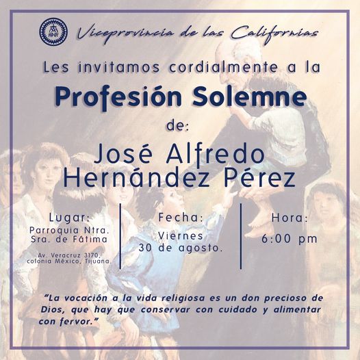 Con mucha alegría, los invitamos a la Profesión Solemne de José Alfredo Hernández Pérez el día viernes 30 de agosto a las 6pm en la Parroquia Nuestra Señora de Fátima (Tijuana).