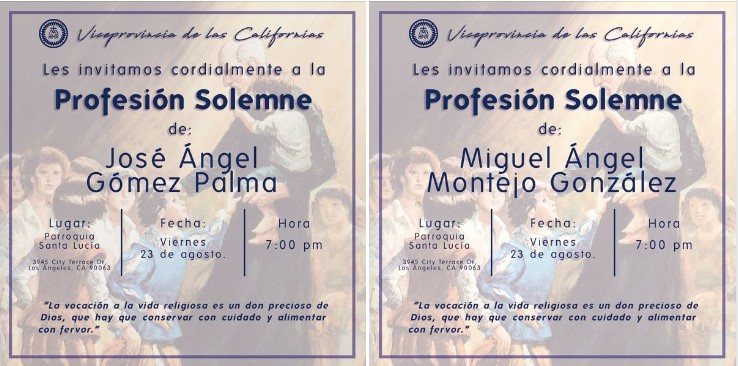 Nos llena de inmensa alegría invitarles a la celebración de las Profesiones Solemnes de José Ángel Gómez Palma y de Miguel Ángel Montejo González el día viernes 23 de agosto a las 7pm en Parroquia Santa Lucía (Los Ángeles, CA).